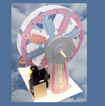 モーターと大径のプーリーを輪ゴムでつないで、大きな車輪状の観覧車をゆっくりと回転させます。